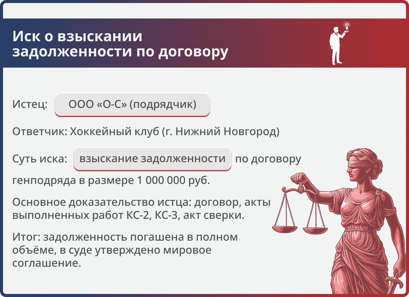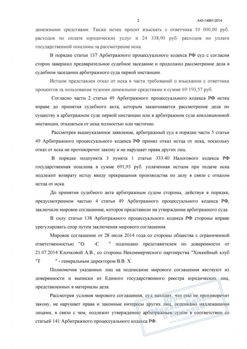 В результате переговорного процесса хоккейный клуб признал задолженность и в полном объёме перечислил ООО «О-С» 1 000 000 рублей. Поданный в суд иск завершился утверждением мирового соглашения, которое зафиксировало все достигнутые договорённости и гарантировало клиенту получение причитающихся средств.