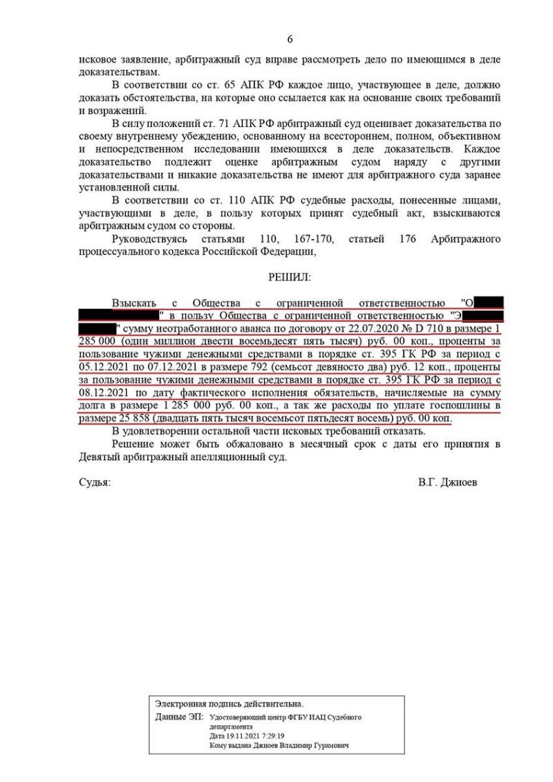 Адвокат проанализировал условия договора строительного подряда, с учетом его положений, а также требований закона подготовил и направил претензию в адрес подрядчика с информацией о расторжении договора подряда в одностороннем порядке, после чего обратился в арбитражный суд с исковым заявлением о расторжении договора подряда и взыскании суммы неотработанного аванса, а также процентов за пользование чужими денежными средствами и расходов на уплату государственной пошлины.
