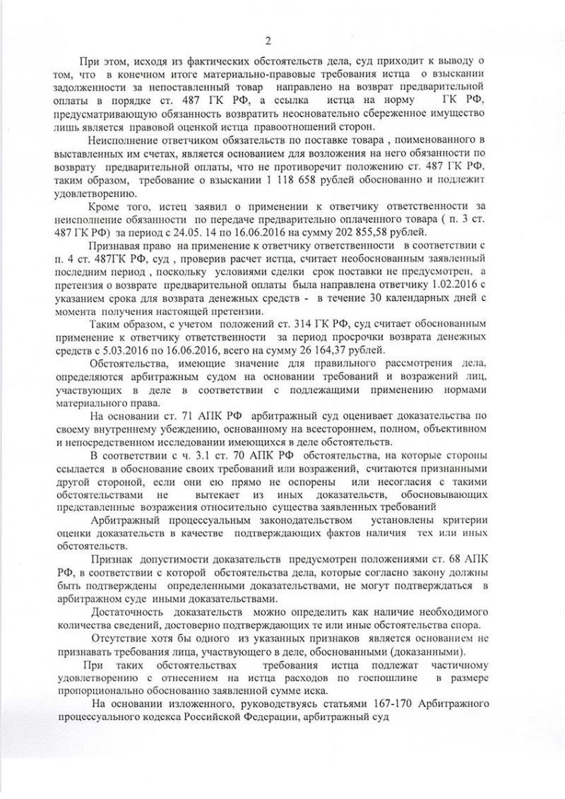 • сумма предоплаты — 1 118 658 руб., проценты за пользование чужими денежными средствами (в размере, определённом на дату вынесения решения), а также расходы по уплате государственной пошлины.