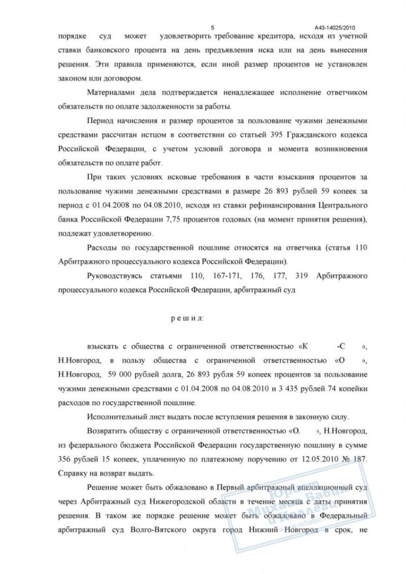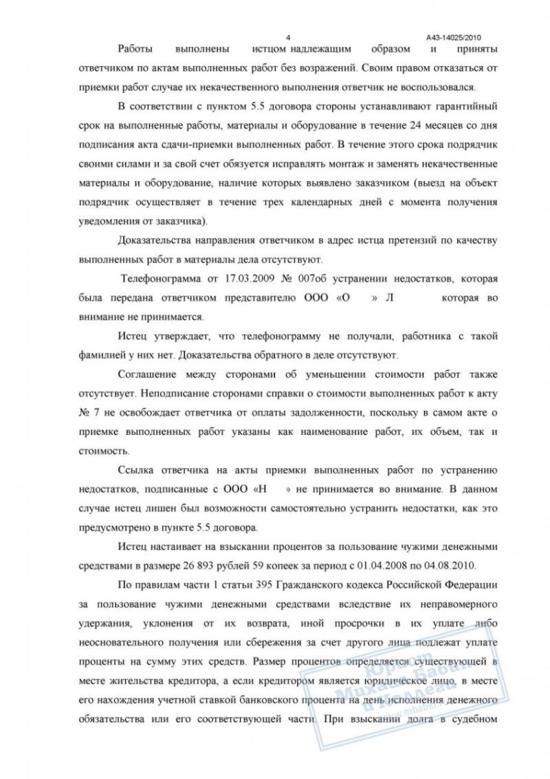 Подрядчик обратился в суд с иском о взыскании недоплаченных 59 000 руб. Юрист коллегии подготовил исковое заявление и собрал доказательства, подтверждающие факт выполнения работ и их приёмку заказчиком. В судебном заседании представитель ответчика пытался обосновать отказ оплаты ссылками на недостатки, однако суд признал эти доводы несостоятельными.