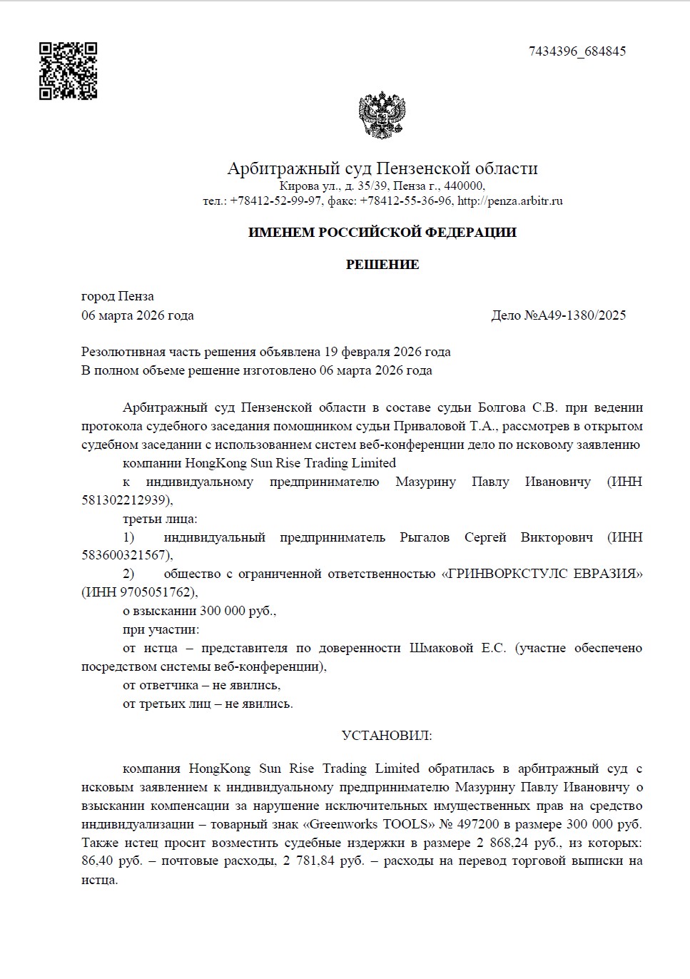 Арбитражный суд Пензенской области полностью отказал компании HongKong Sun Rise Trading Limited в удовлетворении исковых требований. Суд согласился с нашей позицией, признав, что представленные доказательства позволяют отследить всю цепочку поставки и подтверждают введение товара в оборот с согласия правообладателя. Судебные расходы отнесены на истца.