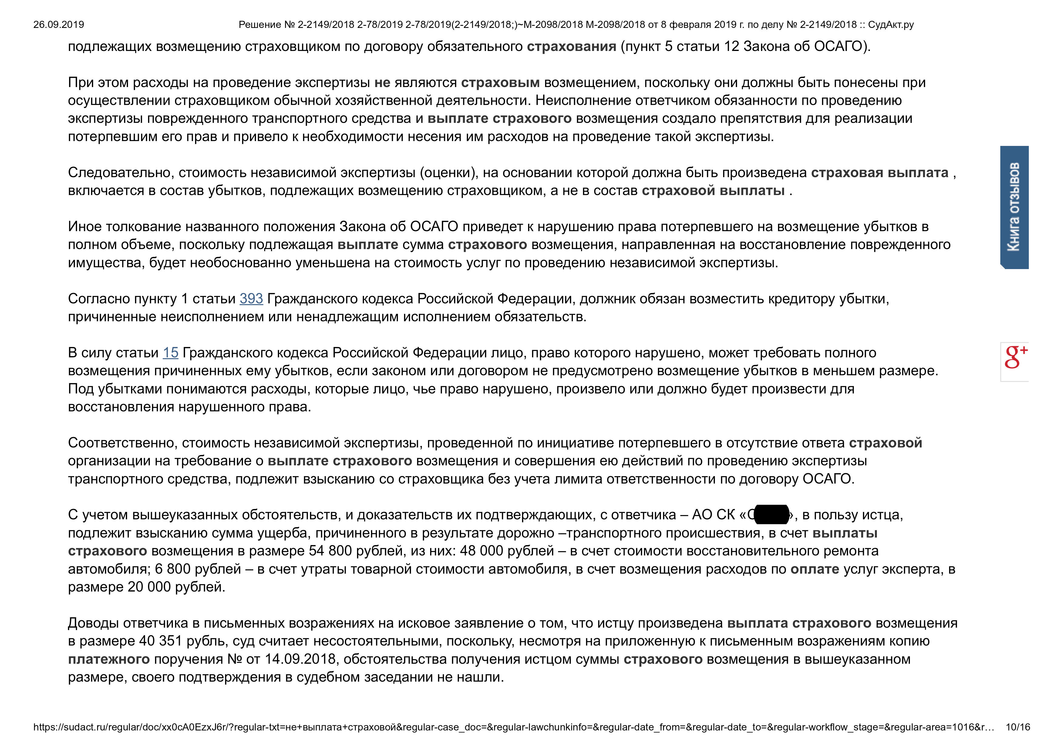 Суд решил: Взыскать с ответчика в пользу истца в счет возмещения ущерба, причиненного в результате дорожно – транспортного происшествия: в счет выплаты страхового возмещения – 54 800 рублей; в счет возмещения расходов по оплате услуг эксперта – 20 000 рублей; в счет компенсации морального вреда – 8 000 рублей; в счет уплаты штрафа ответчика – 27 400 рублей, в счет возмещения судебных расходов: по оплате услуг нотариуса – 2 490 рублей; по оплате копировальных услуг – 920 рублей; по оплате юридических услуг представителя – 15 000 рублей. Взыскать с ответчика государственную пошлину в доход местного бюджета – 2 744 рубля.