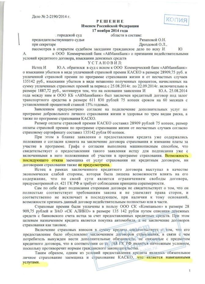 Отказ от страховок после заключения договора — это сложный процесс, поскольку клиент сам подписал согласие на неё. Однако, юристам нашей компании удалось доказать, что в данном случае закон был нарушен и страховка подлежит возврату.