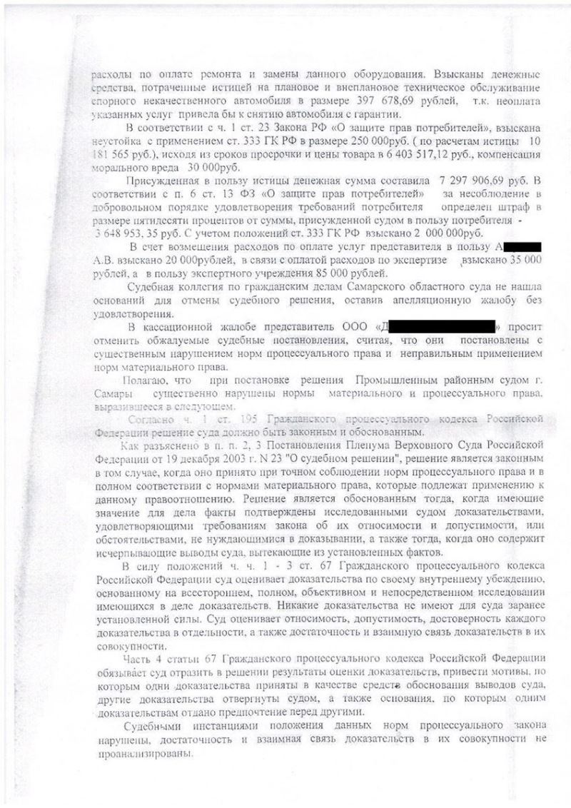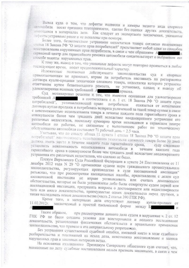 Адвокат вылетел в г. Самару и ознакомился в Промышленном районному суде с материалами дела для составления жалобы. Были найдены основания для отмены решения суда, поскольку при рассмотрении дела допущены как процессуальные нарушения так и по существу спора суду следовало отказать в иске, поскольку не доказано наличие именно заводского брака, а наличие обычных технических неисправностей не является основанием для взыскания полной стоимости нового автомобиля.