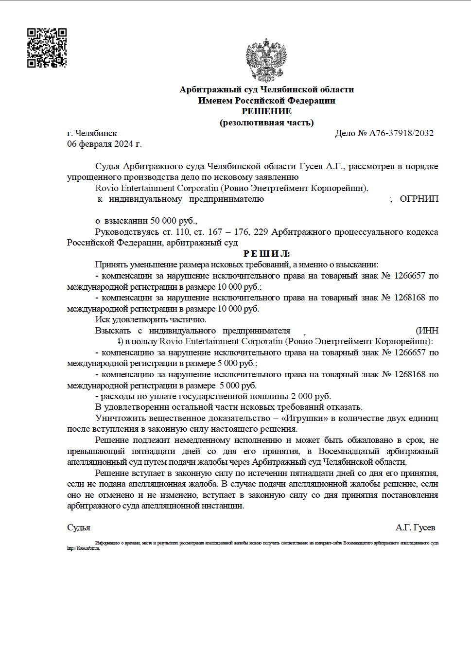 Защита ИП от претензий правообладателя Rovio: снижение компенсации на 80%