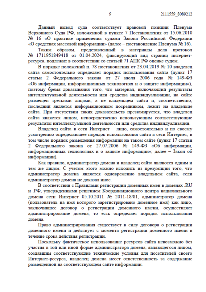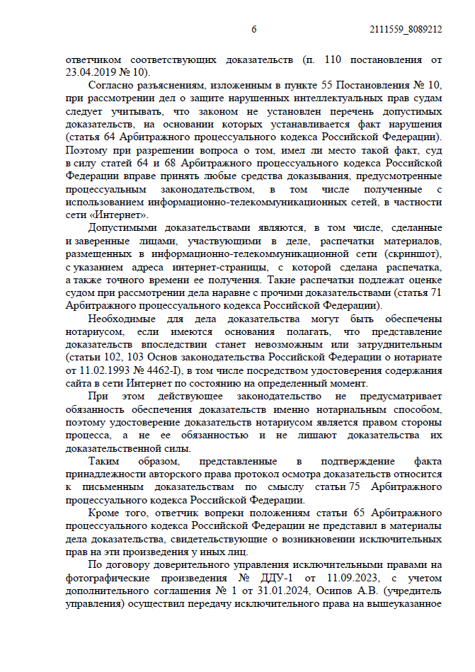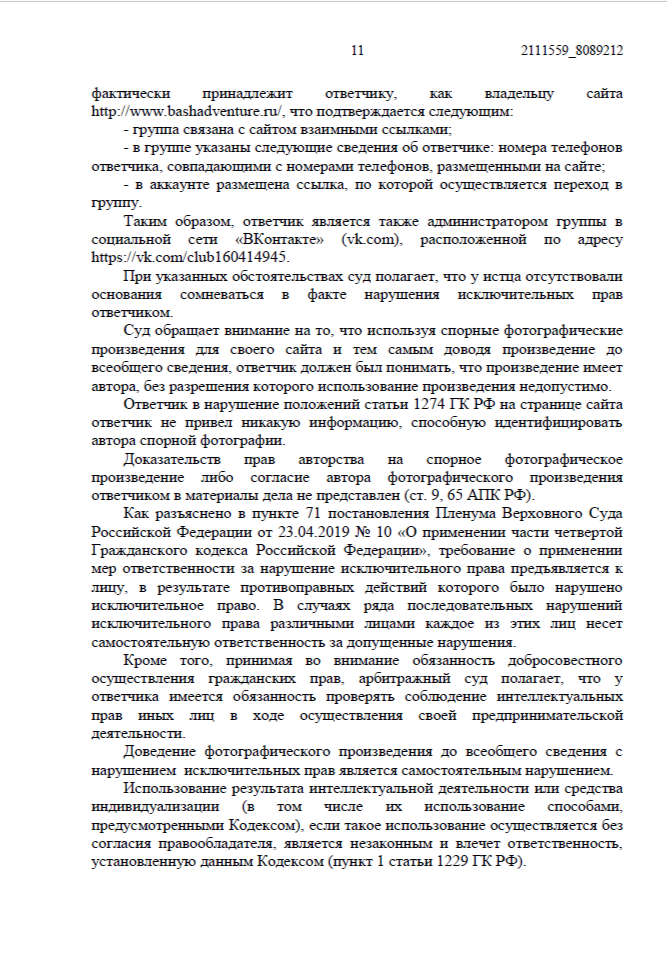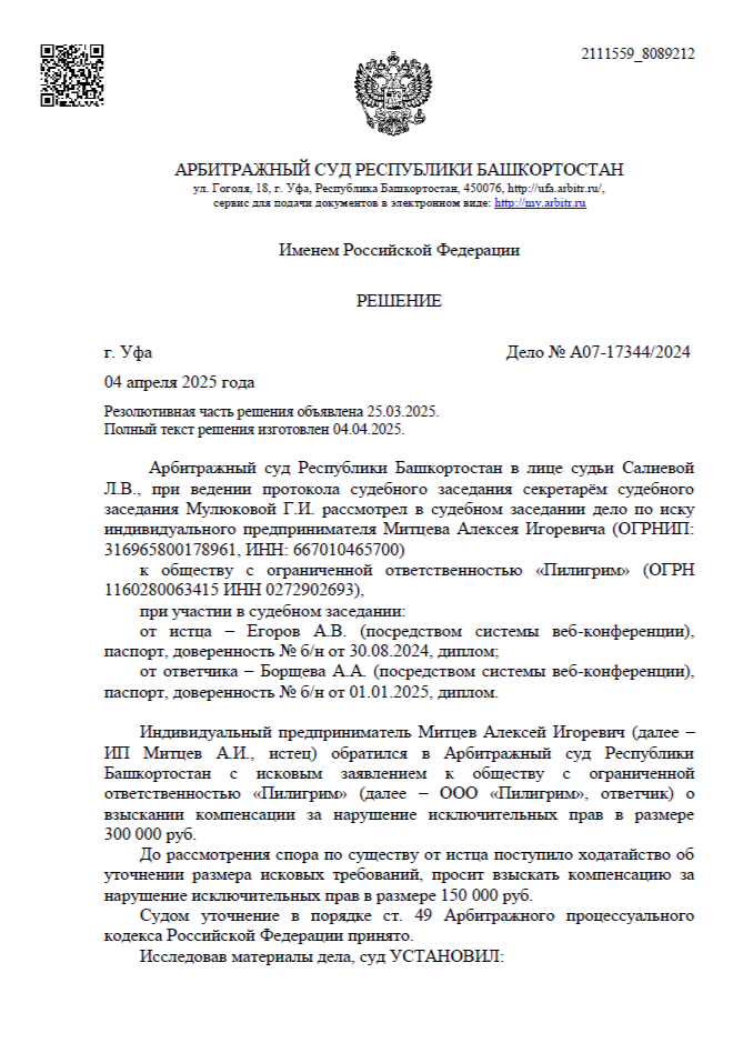 Нарушение было зафиксировано автоматизированной системой «Цифровое Око» (онлайн-сервис для фиксации информации в интернете, созданный для юристов, правообладателей и специалистов по интеллектуальной собственности). Мы собрали доказательства, нотариально подтвердили авторство и подали иск в Арбитражный суд Республики Башкортостан.