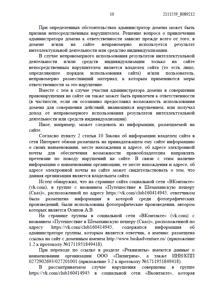 • Показали суду, что группа и официальный сайт компании связаны перекрестными ссылками, а номера телефонов в соцсети совпадают с контактами фирмы. Это подтвердило, что нарушение совершено именно ООО «Пилигрим» в коммерческих целях.