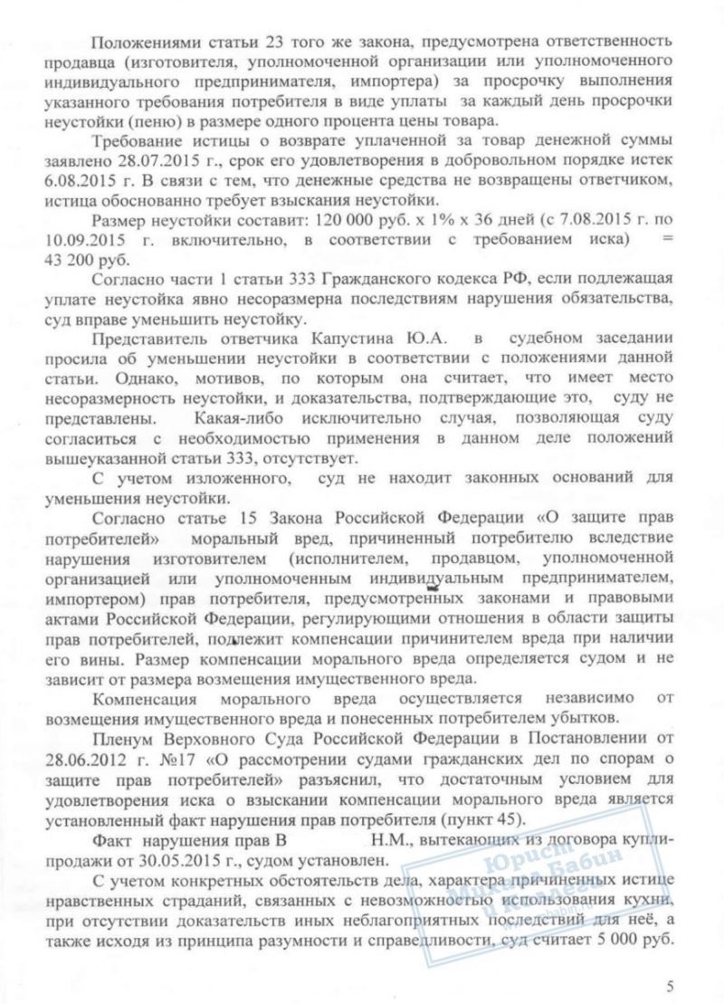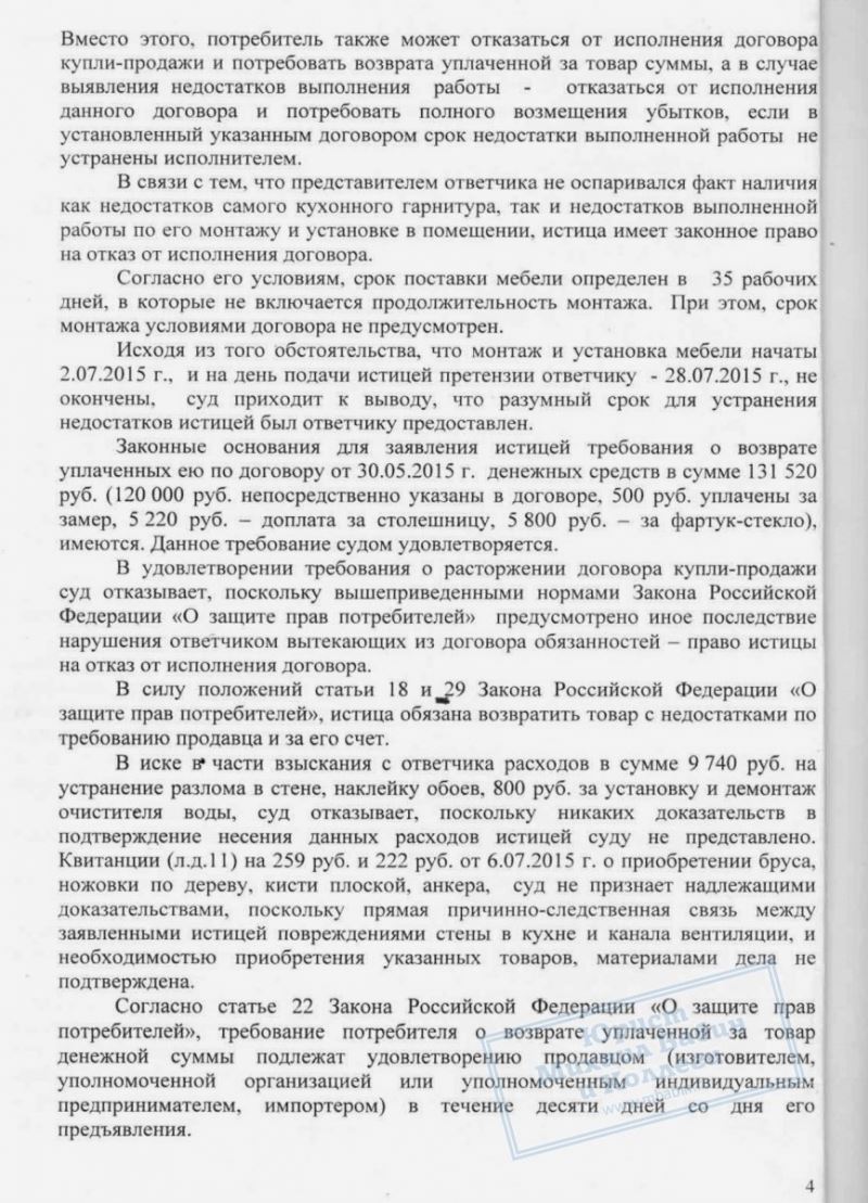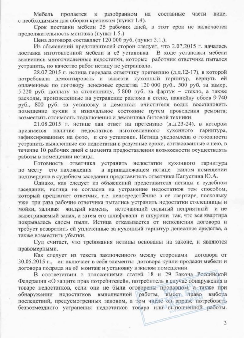 ООО "З" заключили со своей покупательницей договор купли-продажи и установки кухонного гарнитура за 120 000 рублей. В ходе установки мебели покупательница обнаружила многочисленные недостатки, которые работник "З" пытался устранить, но качество работ клиентку не устроило, и она подала в суд.