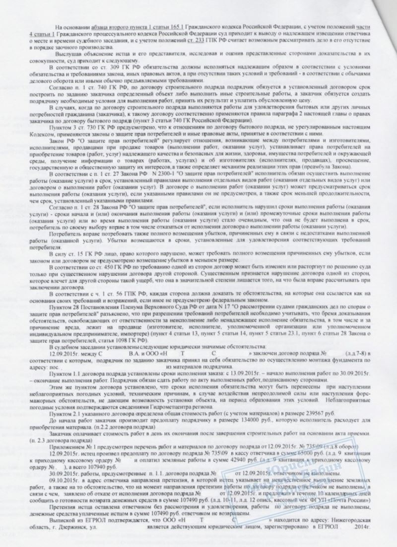Наш клиент С. решил построить загородный дом и 12 сентября подписал договор со строительной компанией «Н» на заливку фундамента. Срок был установлен до 30 сентября. С. выплатил задаток 108 000 рублей. Однако подрядчик не торопился: работы начались позже, к обещанной дате фундамент готов не был. Начались осенние дожди и похолодание — заливка бетона стала невозможной, и стройку пришлось отложить на неопределённый срок. С. обратился к нам. Мы посоветовали направить подрядчику письменную претензию с требованием расторгнуть договор и вернуть задаток. Компания «Н» на мировую не пошла. Тогда мы подготовили исковое заявление в суд и отстаивали интересы клиента в рамках Закона о защите прав потребителей.