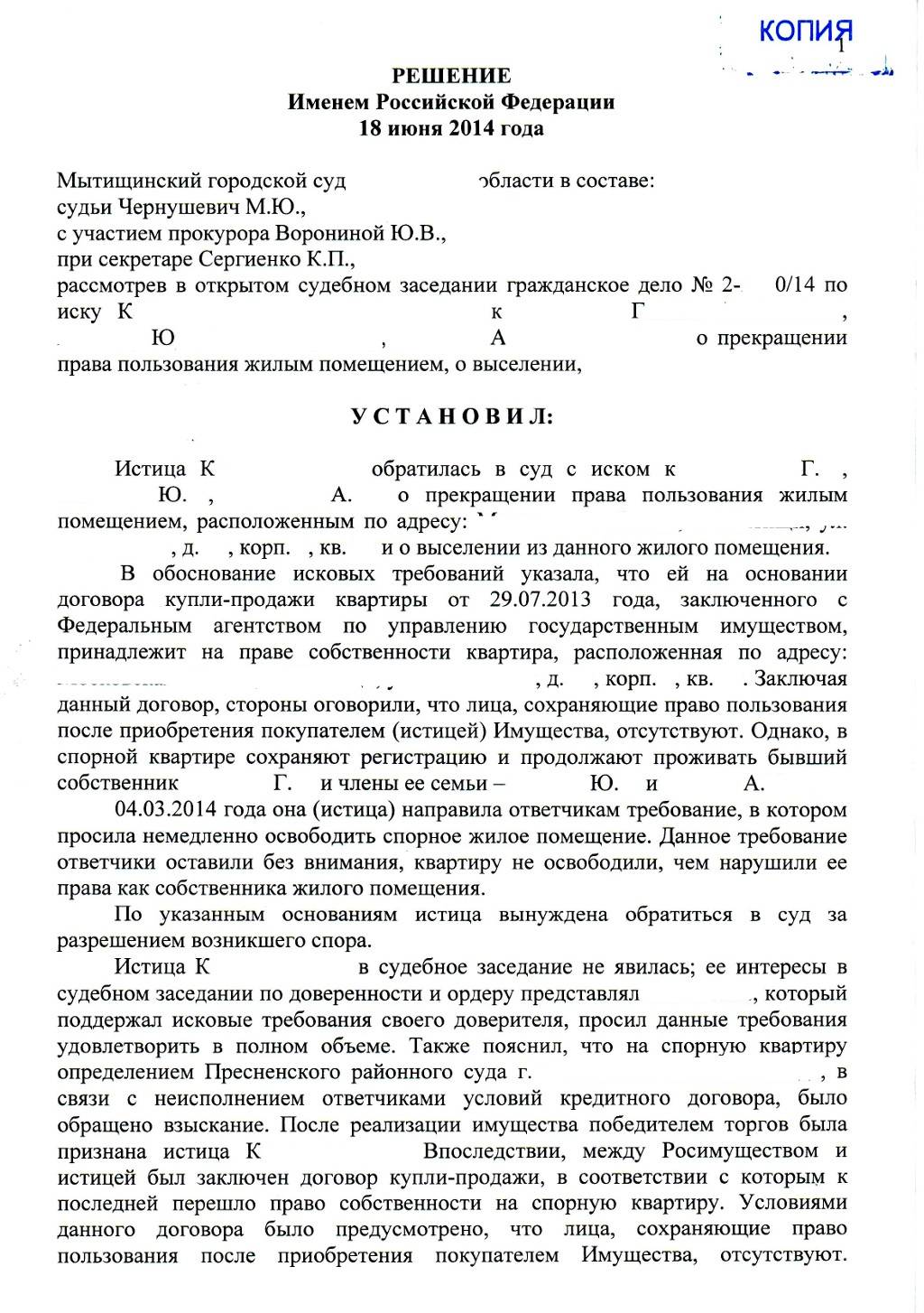 Учитывая все материалы дела, заслушав представителей истицы и ответчика, при участии прокурора, судья принял решение об удовлетворении исковых требований – прекращении права пользования жилым помещением, выселении ответчика и членов его семьи и снятии с регистрационного учета по данному адресу.