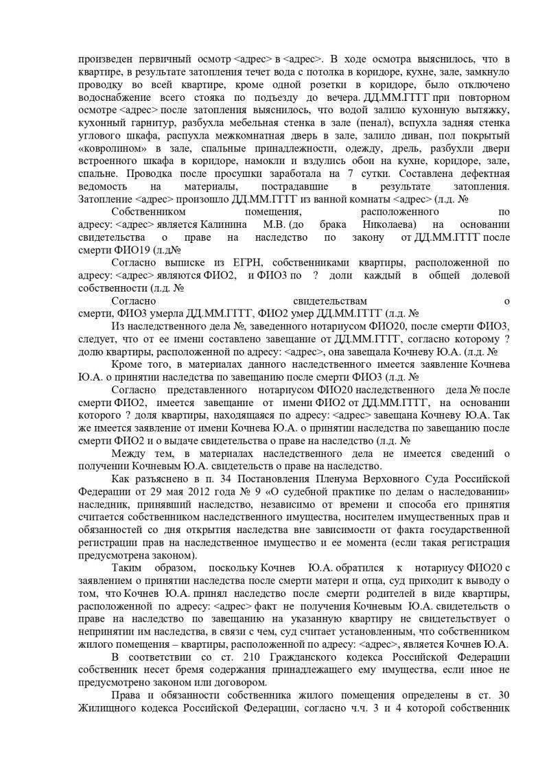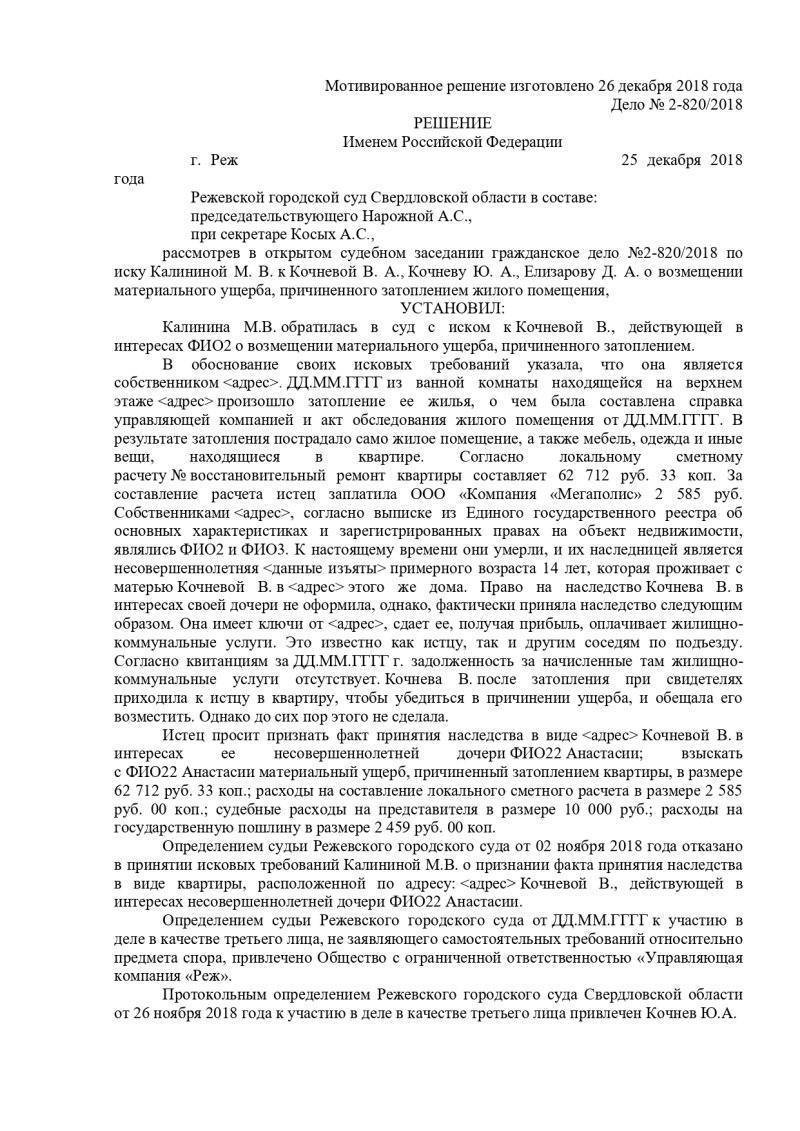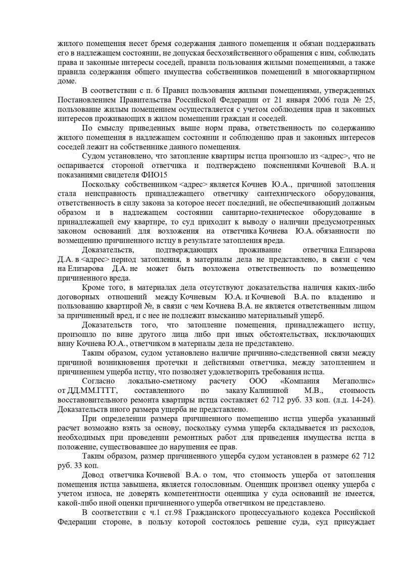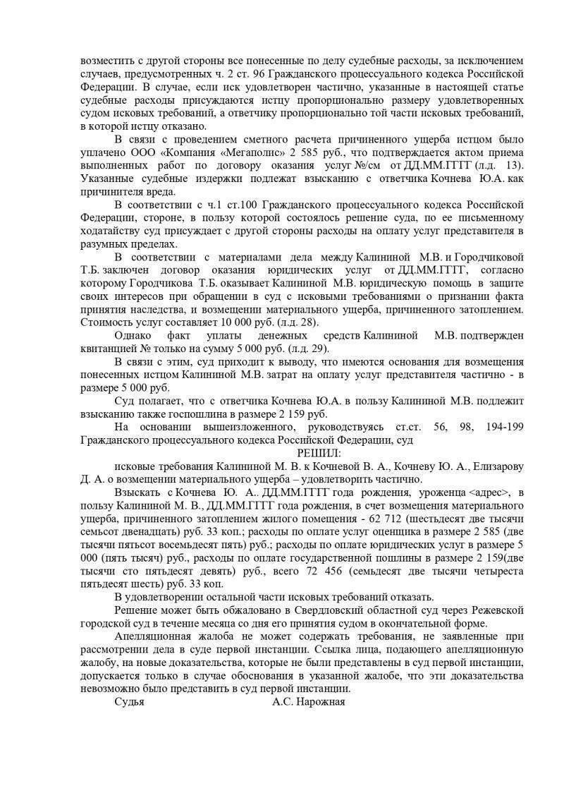 Суд, изучив предоставленные материалы дела, заслушав представителя истца – адвоката, принял решение взыскать с сына, в пользу истца, в счет возмещения материального ущерба, причиненного затоплением жилого помещения; расходы по оплате услуг оценщика; расходы по оплате юридических услуг; а также расходы по оплате государственной пошлины.